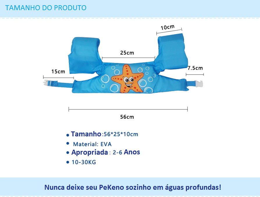A Boia/Colete não é uma Material Profissional para ser utilizado em águas profundas, não pode ser substituída por Coletes profissionais para ser utilizados em piscinas profundas e mar aberto. E deve estar sob a supervisão de um adulto.
