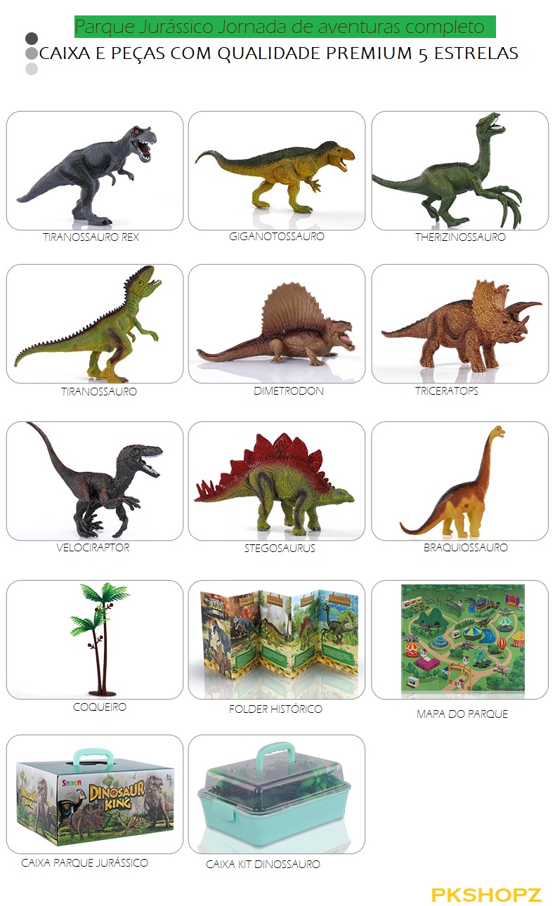 Parque Jurássico Jornada de aventuras inclui Tyrannosaurus Rex, giganotosaurus, therizinosaurus, Stegosaurus, Triceratops, Velociraptor, acrocanthosaurus, Brachiosaurus, Dimetrodon em um total de 9 dinossauros. Fabricado em PVC atóxico e pintado à mão, torna-os mais duráveis e realistas. Grandes figuras de dinossauros de todos os tipos garantem a segurança das crianças, eliminando ASFIXIA.
